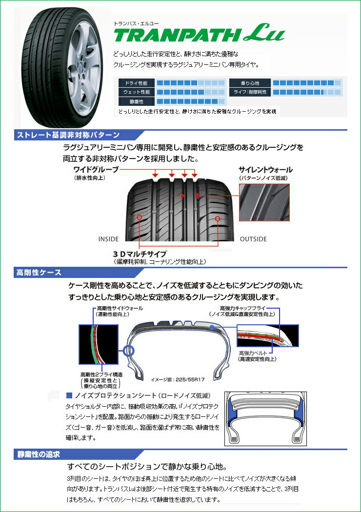 タイヤ詳細 タイヤ名 TOYO TIRES TRANPATH Lu サイズ 225/50R18 95W ホイール詳細 ホイール名 WORK LANVEC LF1ワーク ランベック エルエフワン サイズ 18インチ 8.0J 5H P.C.D 114.3/100 インセット 65〜3518インチ 7.5J 5H P.C.D 114.3/100 インセット 59〜4118インチ 7.0J 5H P.C.D 114.3/100 インセット 53〜42■付属品 センターキャップ・エアバルブ カラー カットクリア (MSP) 適合車種 タイヤサイズ : 225/50R18 の適合参考車種 ・掲載の車種は、純正タイヤサイズと一般的なインチアップサイズに基づいたデータです。