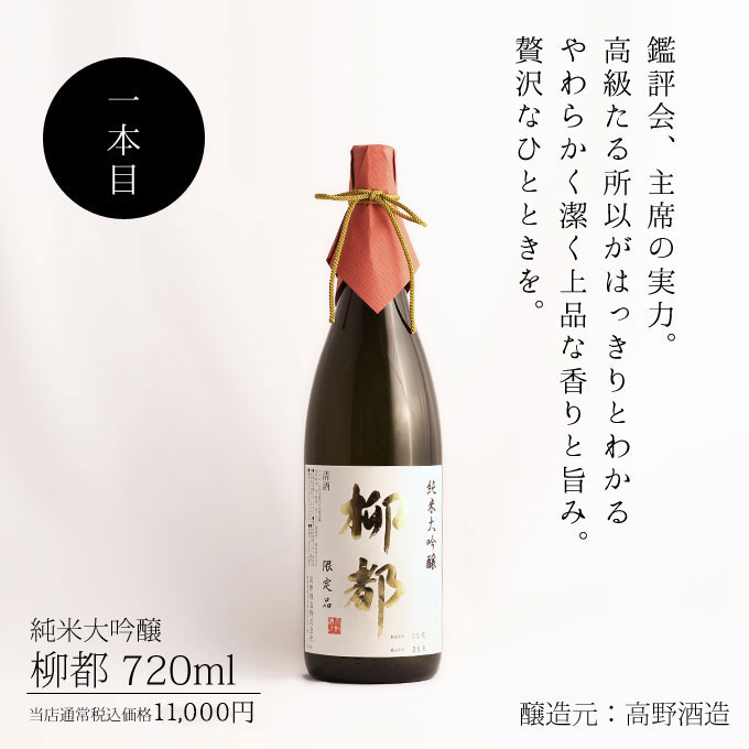 第58回関東信越国税局酒類 鑑評会、金賞を首席で突破した最高の技術を駆使して造り上げられたこの柳都は、上品な甘く澄んだ香りをもち、旨味に広がりと柔らかさ、その旨味はまろやか に膨らんで、そして潔く消える絶品となっております。
