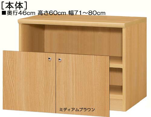 商品仕様 ■タイプ: 扉付 タフ棚板(棚板厚さ2.5cm)タイプ 両開き ■棚板耐荷重: 30kg ■外寸: 奥行46cm×高さ60cm×幅71〜80cm (幅は1cm単位でオーダーできます) ■外寸(幅): 71cm 72cm 73cm 74cm 75cm 76cm 77cm 78cm 79cm 80cm ■扉高(実寸): 41.5cm ■棚板枚数 移動固定棚板:1 共通仕様 ■材質: プリント化粧繊維板 ■塗装: ウレタン樹脂塗装 ■素材: ホルムアルデヒドの発生を最小限に抑えた基材・芯材・プリント紙・接着剤(F☆