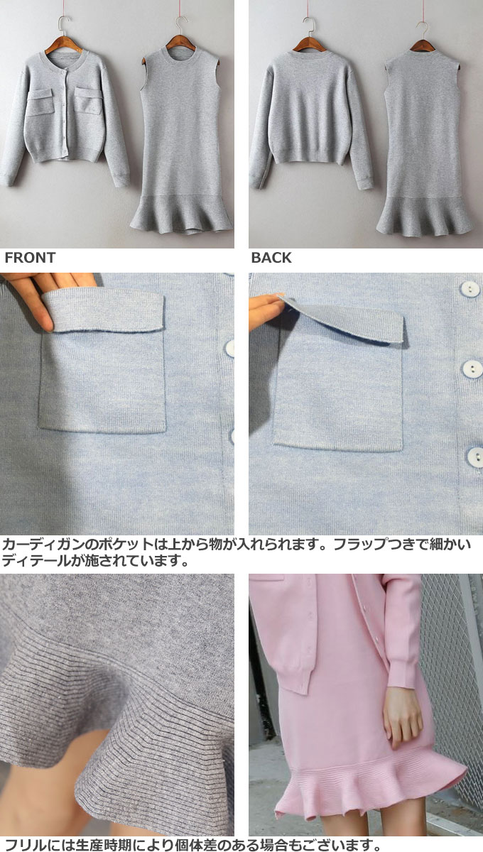 セットアップ ニットワンピース ニットワンピ カーディガン 長袖 ノースリーブ かわいい おしゃれ らくちん ピンク ブルー 青 黒 ブラック グレー 秋 新作 春 2way あったか 暖かい マーメイドライン ミニ パーティ 参観日 ブロガー インスタ トレンド [su-003]