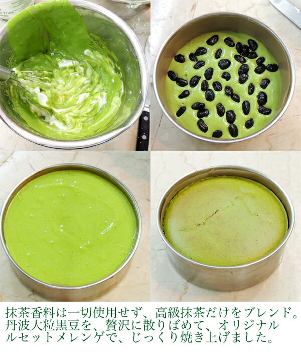 フランス産クリームチーズとノルマンディ産フロマージュブランと生クリーム、高級抹茶を惜しげもなく贅沢にブレンドして、中に砂糖だけで煮上げた、丹波黒豆をゴロゴロ忍ばせ、オリジナルじっくり仕上げた焼き上がりに、更に抹茶の香るグラサージュでコーティングしました! 冷蔵庫温度(2〜5℃)では、濃厚にこってり!常温(10〜20℃)では、口の中で速やかにとろけるような極上感。