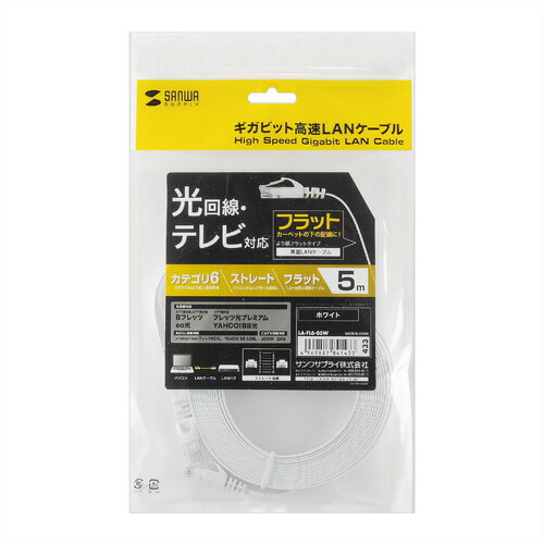 <仕様>■カラー:ホワイト ■ケーブル長:5m■コネクタ形状:RJ-45スリムコネクタ付き(ラッチカバー付き) ■ケーブル構造:より線フラットツイストペアケーブル(AWG30)、ストレート全結線 ■ケーブル直径:1.5mm×6.2mm■対応伝送帯域:カテゴリ6(1000BASE-TX)、エンハンスドカテゴリ5(1000BASE-T)、カテゴリ5(100BASE-TX)、カテゴリ3(10BASE-T)適合■対応機器:ADSLモデム、CATVモデム、FTTH、デジタルテレビ、ハードディスクレコーダ(RJ-45ポートを持つ機種)、INS64(30m以下)対応 ■対応環境:ADSL回線(フレッツADSL、Yahoo!BB ADSL)、光回線(Bフレッツ、フレッツ光プレミアム、eo光、Yahoo!BB光)、CATV回線(J:COM ZAQ)